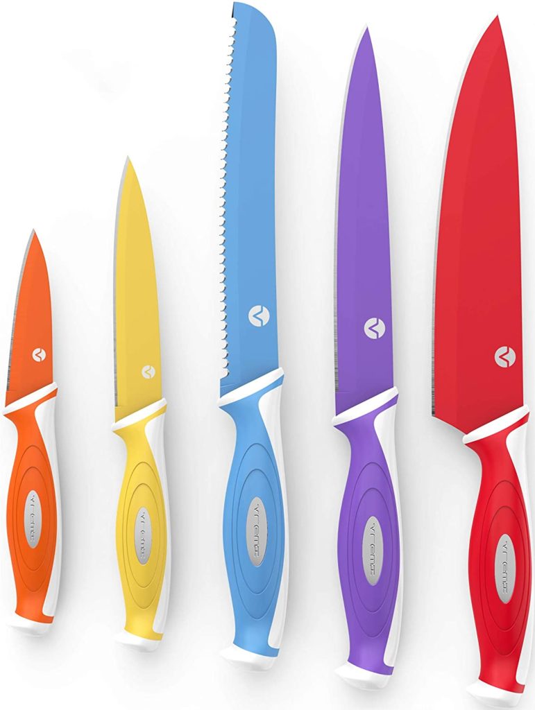 Let’s start with those number of colors! The Vremi ten-piece knife set will definitely add flair to your kitchen aesthetic with its five brightly colored knives. They also feature a nonstick coating that enhances their user-friendliness. This set is for the home chef who enjoys using the “proper” knife but is also inspired by a splash of pizazz.